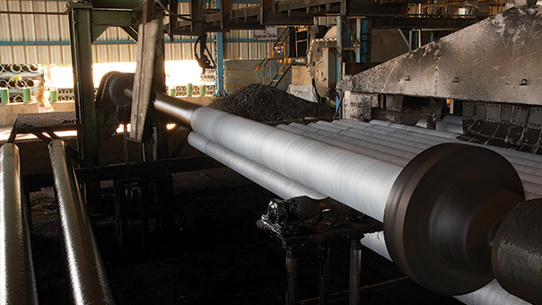 The pipes are preheated in a hot chamber to dry any moisture from steam curing and to give better adherence to paint. Bituminous paint is applied by a spraying machine which ensures uniform coating of the Ductile Iron Pipe. Coating is applied on clean surface i.e. dry and free from dust. It must be smooth and tenacious and hard enough not to flow when exposed to a temperature of 65 ºC but not so brittle at a temperature of 0 ºC as to chip off when scribed with a penknife. The mean thickness of the coating shall not be less than 70 μm and the local minimum thickness shall not be less than 50 μm. For corrosive soils, excess bituminous coating can be provided.