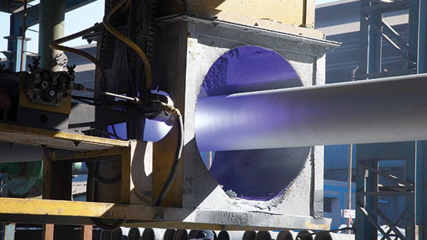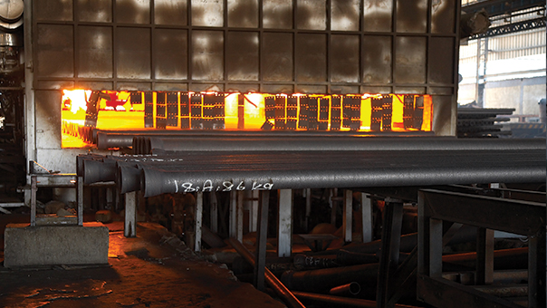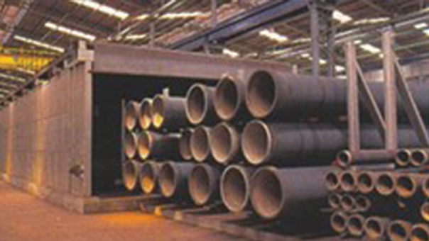 The cast pipes are heat treated in an annealing furnace to optimize the strength impulses and ductility of the pipes. The annealing furnace will be of a continuous chain type and will be LDO fired. Annealing furnace will have a pre-heating zone, soaking zone, fast cooling zone and controlled cooling zones. Pipes entering pre-heating zone at 600 ºC will be heated to 940 ºC. Pipes then enter the soaking zone, where they will be maintained at 940 ºC followed by cooling to 780 ºC in fast cooling zone. Pipes finally enter controlled cooling zone, where they are cooled to 600 ºC. Pipes will be moving inside AF on casting iron rails and pushed by fingers on closed dog type chain.